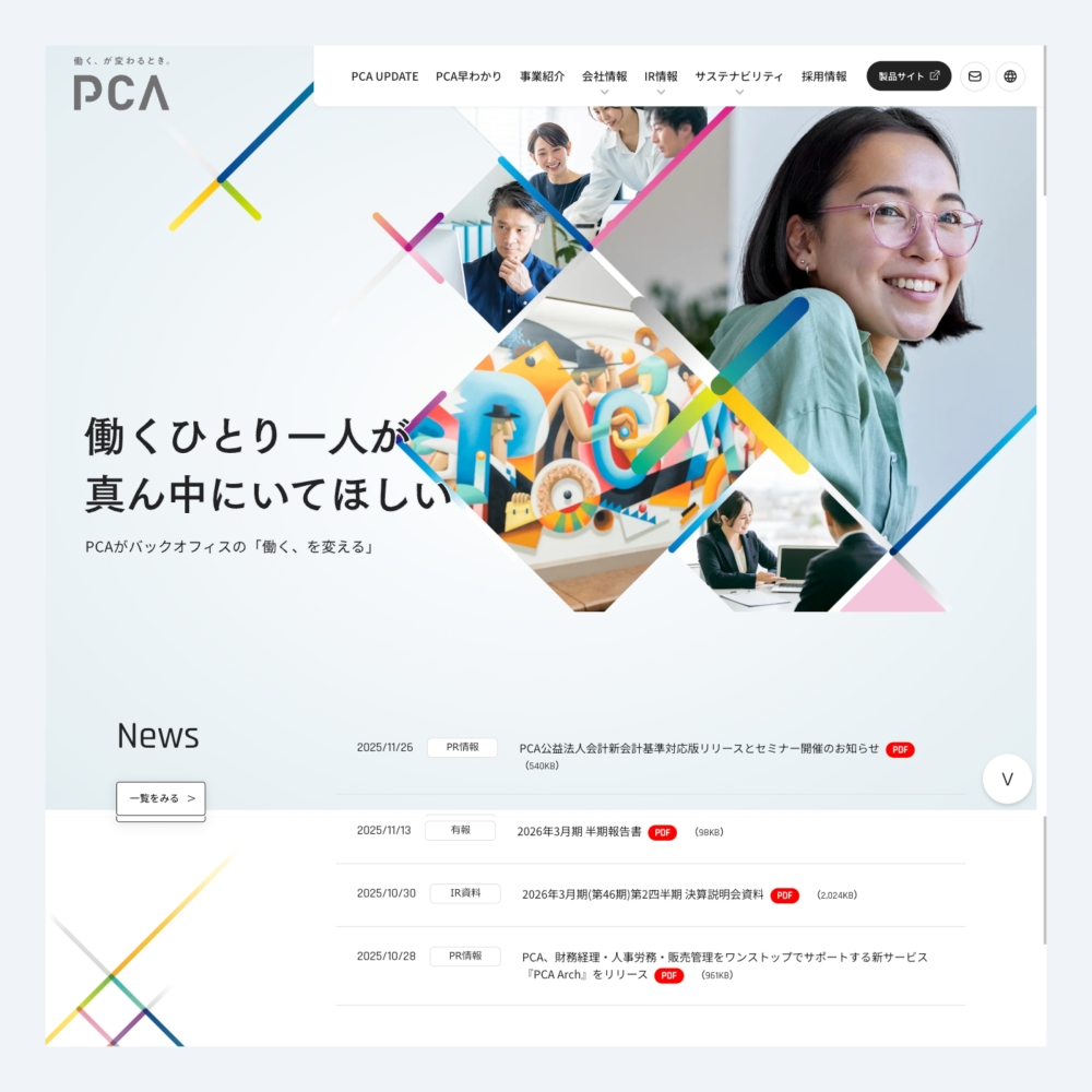 2025年、業務用ソフトウェアのリーディングカンパニーであるピー・シー・エー株式会社様は、コーポレートサイトを全面的にリニューアルされました。このリニューアルは、同社のビジョンである「バックオフィスの“働く、を変える”」を体現し、企業の変革を支える情報発信基盤としての役割を強化することを目的としています。