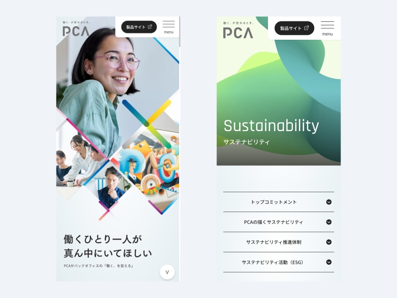 特に「PCA UPDATE」の表現では、機能的な見やすさと企業らしさの両立にこだわり、細部にわたって丁寧に設計しています。