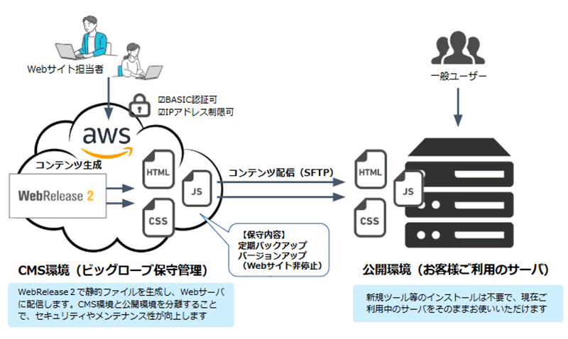 WebRelease2は、運用者がアクセスするCMS環境と、一般ユーザーがアクセスする公開環境を分離するCMSです。